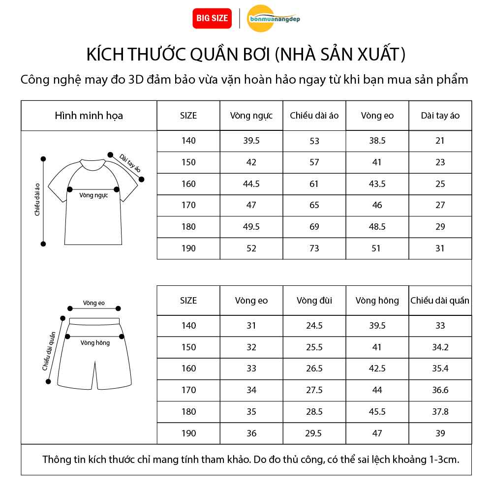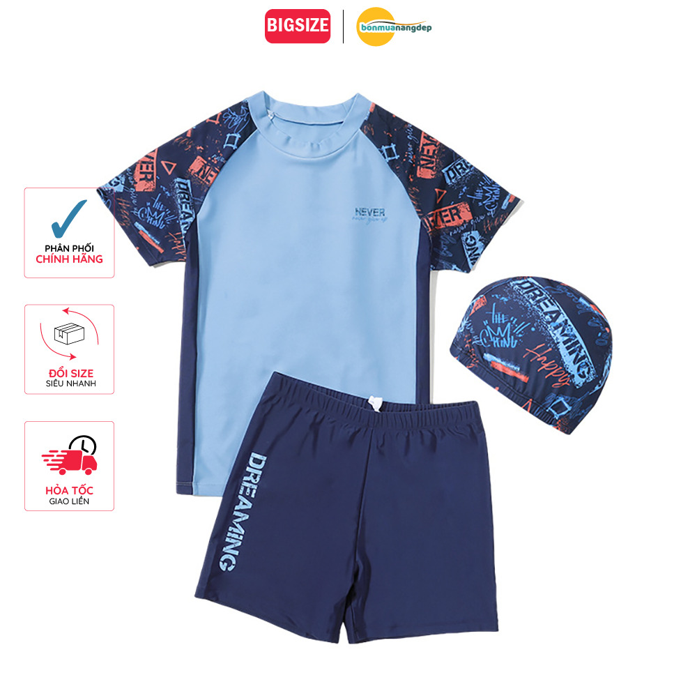 BỘ ĐỒ BƠI BÉ TRAI TAY NGẮN QUẦN NGẮN BIG SIZE KÈM MŨ. SIZE TỪ 34 – 73KG.