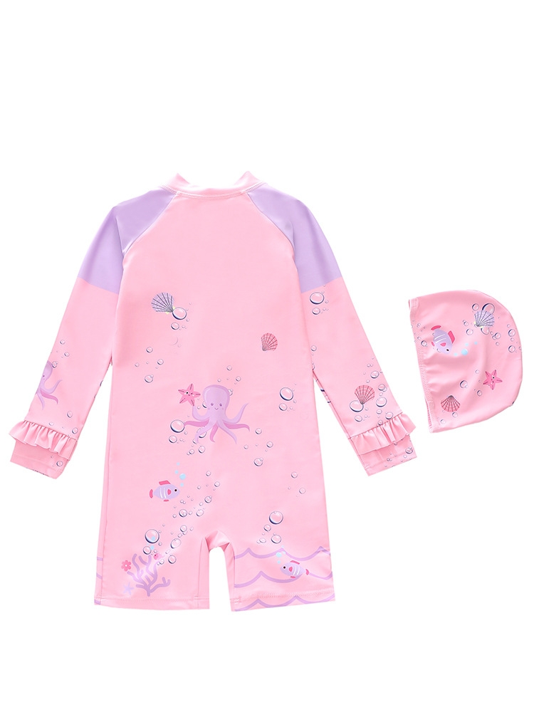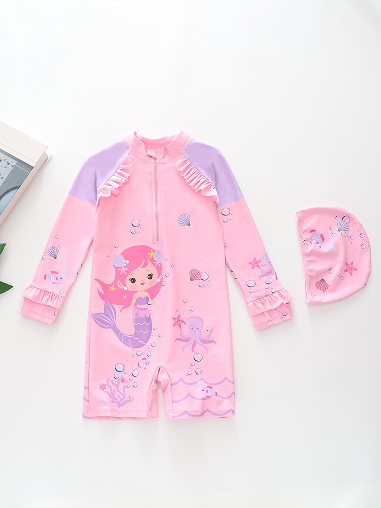 Đồ bơi bé gái liền thân tay dài chống nắng, bèo nhúng điệu đà, khóa kéo trước, tặng kèm nón bơi size 16-34kg