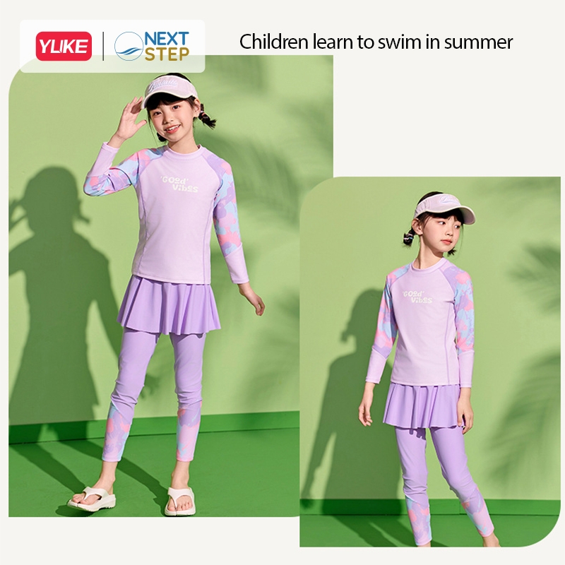 ✅ Bộ bơi gồm Áo bơi tay dài + Quần bơi dài phối chân váy liền điệu đà, kín đáo, chống nắng bảo vệ da bé khi bé hoạt động ngoài trời.