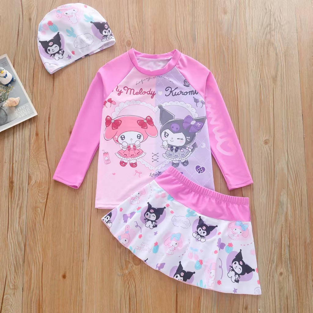 Đồ bơi bé gái tay dài váy rời Kuromi and Melody tặng kèm nón bơi xinh xắn