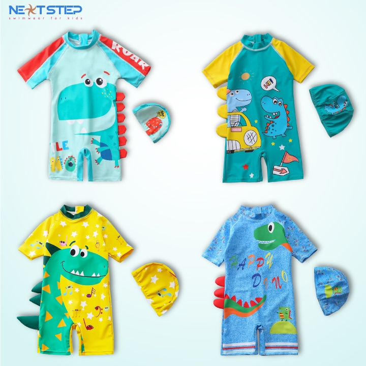 Đồ bơi bé trai tay ngắn quần ngắn liền thân, họa tiết khủng long cho bé size từ 12-34kg