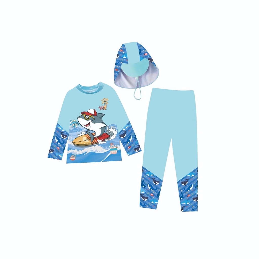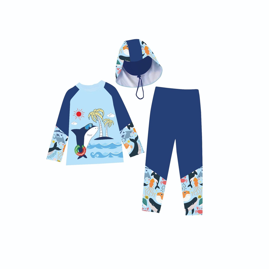 Đồ bơi bé trai tay dài quần dài họa tiết đại dương kèm nón che gáy chống nắng size từ 16-34kg