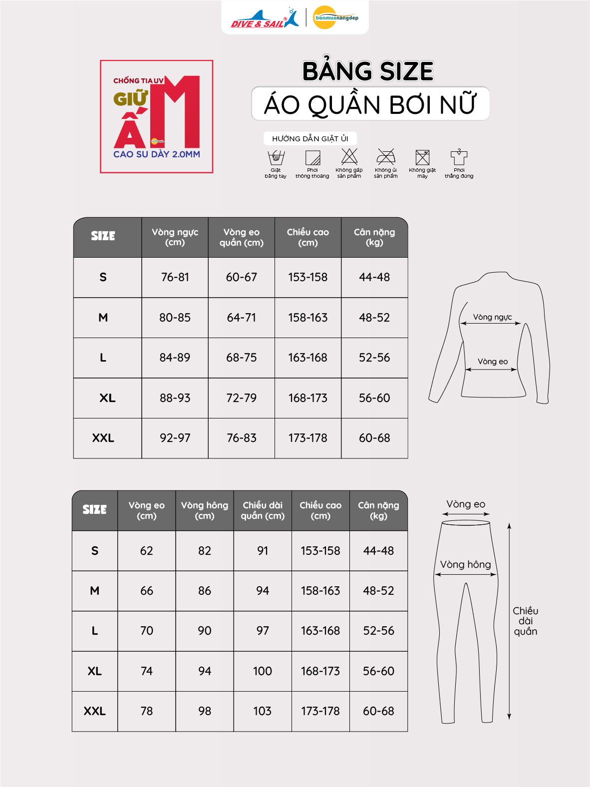 ✓ Đồ bơi giữ nhiệt nữ hiệu Dive and Sail có áo bơi tay dài riêng và quần bơi dài riêng. Quý khách có thể chọn mua áo hoặc quần, hoặc mua nguyên set bơi.